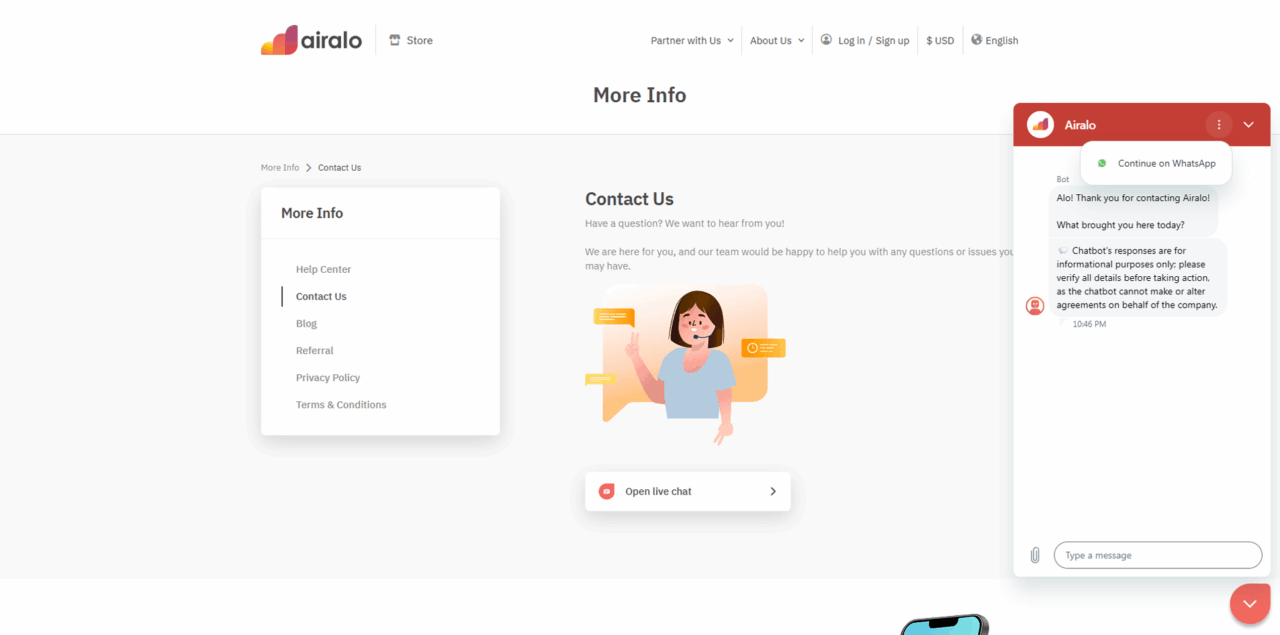 Airalo מציע תמיכת לקוחות 24/7 דרך צ'אט חי ודואר אלקטרוני. מרכז העזרה שלהם כולל גם מדריכים מפורטים ושאלות נפוצות.