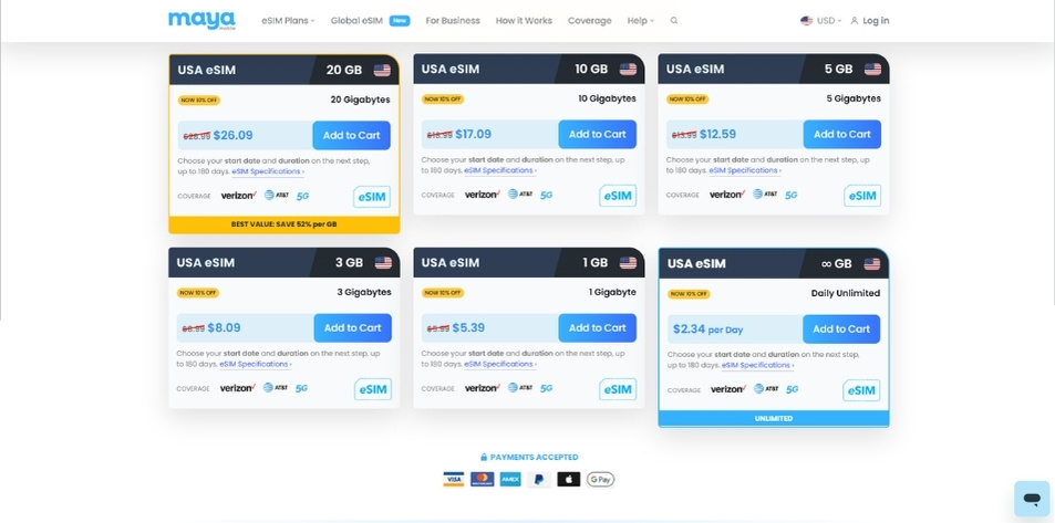 Maya’s pricing offers the best value for money in the market. They provide mostly 5G network access, where available, with large data plans at very competitive rates.